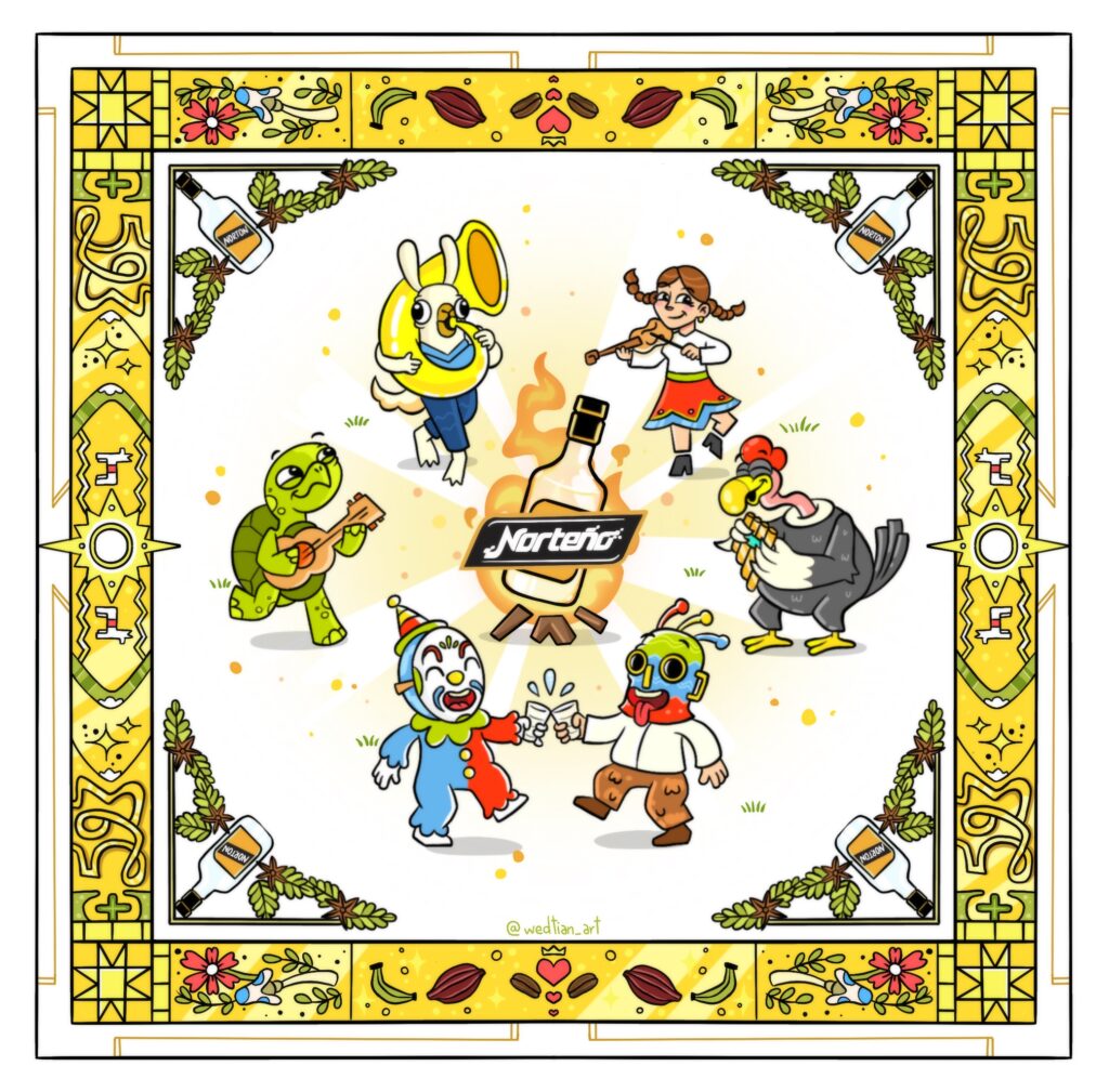Esta obra retrata una fiesta de pueblo ecuatoriana, donde personajes tradicionales bailan y tocan música alrededor de una fogata, símbolo de abrigo, encuentro y celebración. El fuego representa ese momento en el que el frío se va y la comunidad se une, tal como sucede al compartir un trago de Norteño. Animales icónicos del Ecuador el cóndor, la tortuga y las llamas acompañan la escena como guardianes de nuestra identidad y diversidad. La ilustración se enmarca con un borde dorado que integra productos emblemáticos del país como el plátano verde, el cacao y el café, reflejando la riqueza natural y cultural de nuestra tierra. Los laureles de anís, ingrediente principal del Norteño, rodean la composición como homenaje a su receta tradicional. En conjunto, la obra celebra el calor compartido, la memoria colectiva y las raíces ecuatorianas, donde el Norteño no solo abriga el cuerpo, sino también el espíritu.