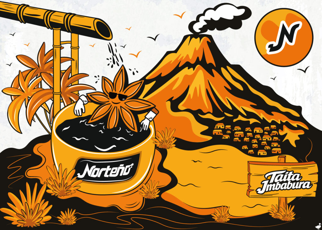 Anisaje es una ilustración digital que propone una interpretación gráfica inédita del proceso de anisado, elemento fundamental en la construcción del sabor característico del licor Norteño. La obra surge de una exploración visual que traduce este proceso en un lenguaje gráfico propio, transformándolo en una narrativa simbólica donde el origen del sabor se vuelve visible y tangible a través de la ilustración. La ilustración construye una narrativa visual donde el anís se transforma en un personaje que interactúa directamente con el jugo de caña, haciendo referencia al proceso de fermentación de la caña de azúcar, base esencial para la elaboración del licor. Esta escena se desarrolla dentro de un vaso de Norteño, convirtiendo el recipiente en un espacio simbólico donde el proceso de anisaje toma forma visual, reinterpretando la transformación del producto desde una mirada artística. En el fondo se incorpora el Taita Imbabura, volcán emblemático de Ibarra, como referente del origen geográfico del licor. Su presencia, junto a elementos del entorno inmediato, refuerza el vínculo entre el producto y su territorio, aportando identidad y contexto cultural a la obra. La cromática responde directamente a los colores característicos de la marca Norteño, utilizados para mantener coherencia visual, fortalecer su reconocimiento y conservar un lenguaje gráfico alineado con la identidad de la marca. El nombre Norteño se integra de forma estratégica dentro de la ilustración como parte del relato visual. De esta manera, Anisaje se consolida como una obra que articula proceso, territorio e identidad a través de una propuesta gráfica original y contemporánea, ofreciendo una representación visual única de la esencia del licor Norteño.