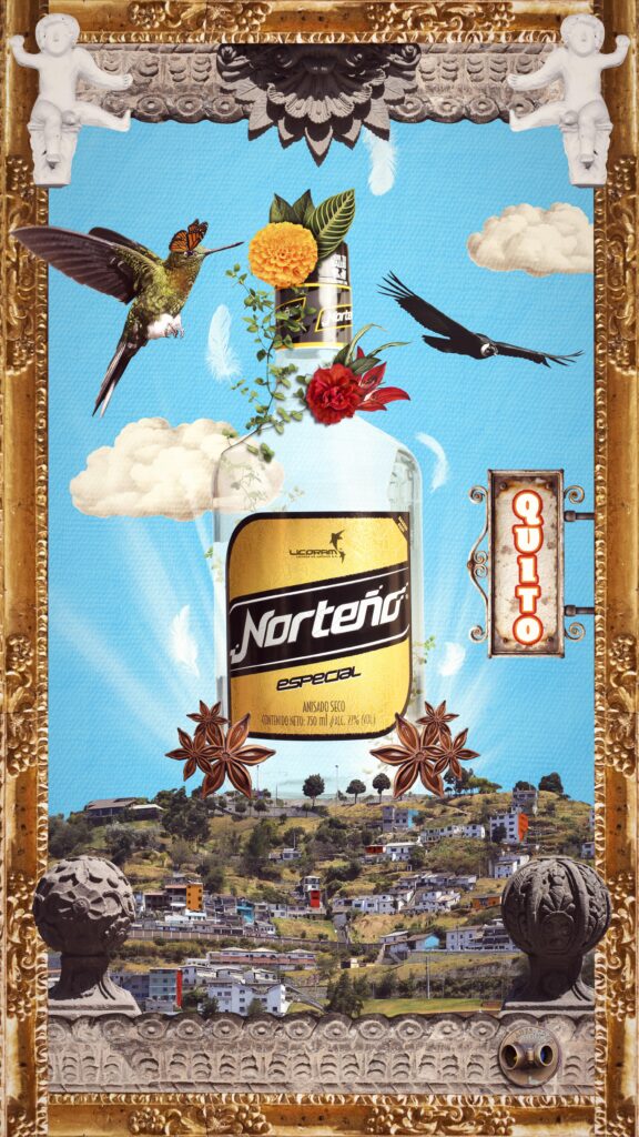 Inspirado en las estampas Quiteñas me dio la idea de recrear una botella de Norteño al estillo Collage digital con un poco de Quito y sus alrededores dandole un toque vintage en la obra.