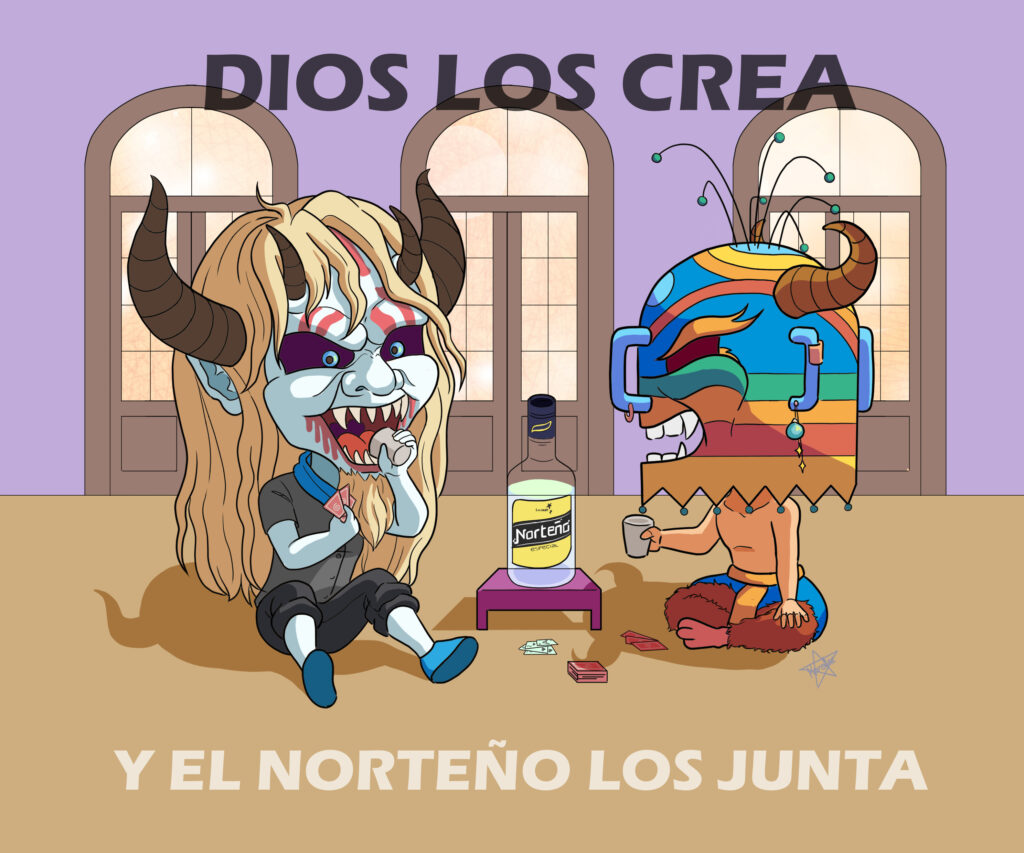 Realicé una ilustración de 2 amigos compartiendo una botella de Norteño mientras juegan cartas y se divierten, lo particular es que se trata del diablo besador de Píllaro y el diablo Huma