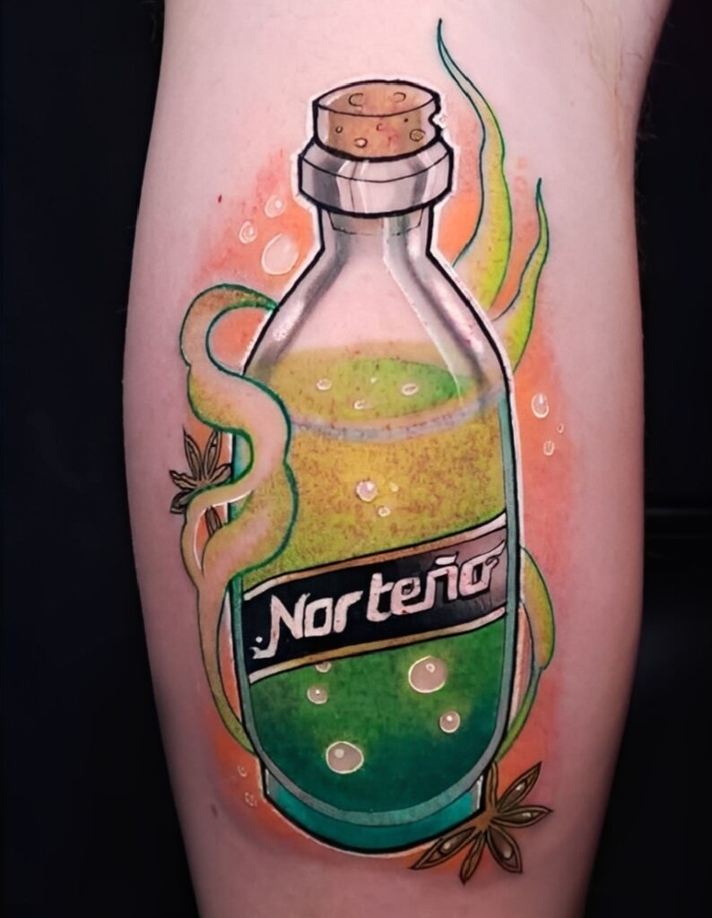 Se nos ocurrió la idea de este tatuaje en honor al norteño que se le puede mezclar con varias cosas es como un brebaje también le pusimos como detalle el aniz