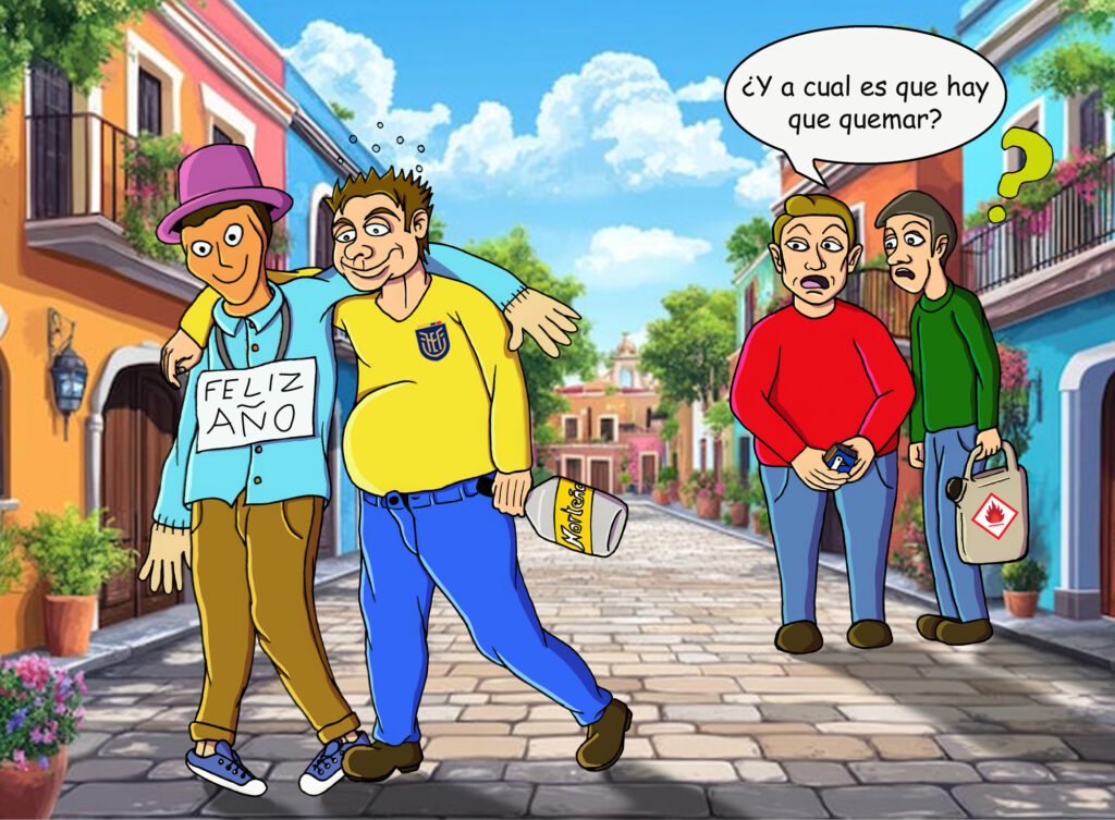 Es una ilustración de arte mixto, hecho a lápiz, coloreada y retocada en digital, montada en una imagen de fondo. Me inspire en los días de fiesta de fin de año y sus tradiciones en Ecuador, intentando de poner un poco de humor a lo ecuatoriano 😁🇪🇨
