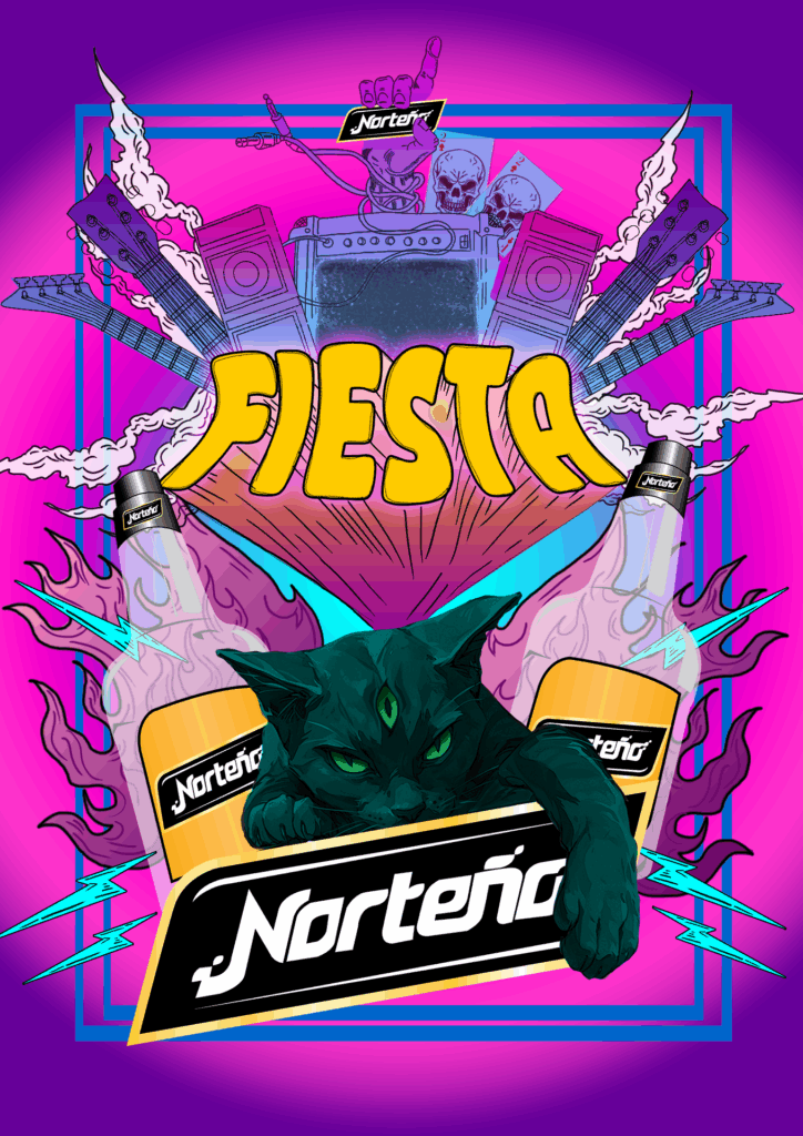 Mi ilustración trata de la fiesta nocturna por ende ilustre un gato que evoca la noche adicional los parlantes y la las guitarras que son instrumentos musicales que pueden interpretar varios generos y sentimientos de autores musicales, puse en escena unas nubes para que den salida a las letras de fiesta para que sea llamativo, el gato tiene tres ojos que quise dar el enfoque del despertar de la conciencia por que con un buen shot de Norteñito nos ponemos euforicos y alegres. Espero les guste mi obra y se que sere unos de los ganadores gracias por el apoyo al talento ecuatoriano.