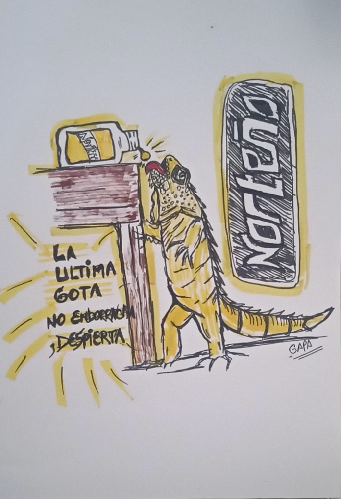 Una botella de norteño acostada en una mesa, donde cae la última gota antes que caiga al suelo, una iguana aparece y la bebe, donde con una gota su cuerpo se vuelve a los colores de la marca siente el sabor inconfundible que es este aguardiente anisado seco de prestigio. En formato A4. Técnica: Marcadores Punta Dual. Soporte: Cartulina. Autor: Galo González. Año:2026