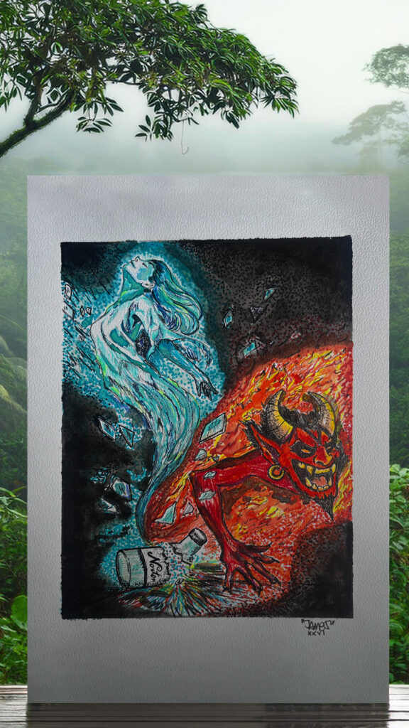 Esta obra nace desde una explosión de una botella de Norteño, liberando lo que estaba contenido dentro, además del licor. Representa la dualidad contenida dentro de la botella, celebración, exceso, disfrute, liberación. Lo humano y lo instintivo contenido en un “salud”!