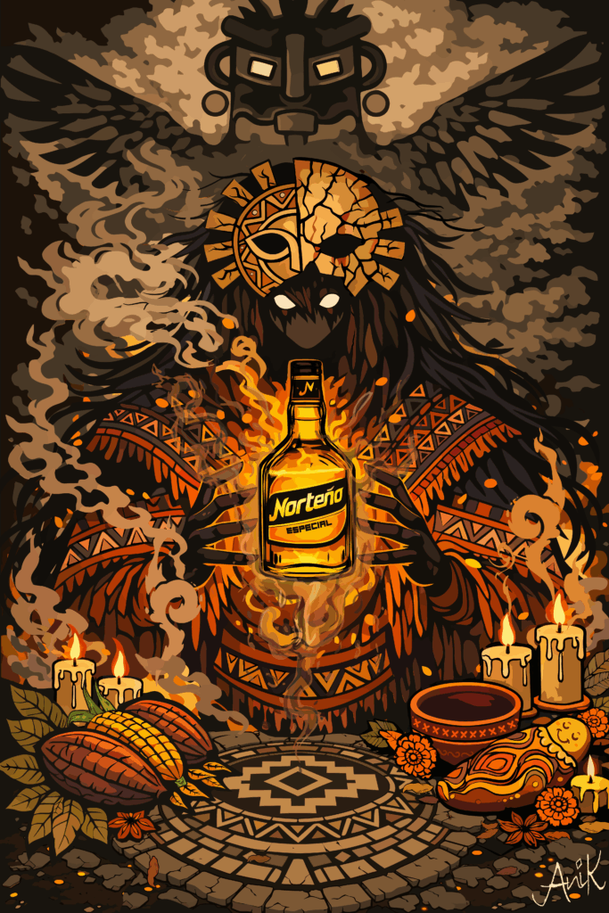 Mi ilustración representa la conexión entre la identidad ancestral del Ecuador y el carácter del Norteño especial. La figura central simboliza un espíritu protector inspirado en la cosmovisión andina, donde el fuego, el cacao y los elementos rituales funcionan como metáforas de origen, fuerza y transformación. La obra busca rendir homenaje a las raíces culturales del Ecuador desde una mirada artística contemporánea, resaltando la energía, el carácter y la identidad que comparten tanto el legado ancestral como la marca. Obra original realizada sin el uso de Inteligencia Artificial.