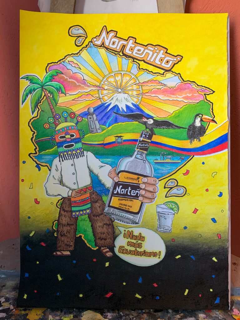El diseño resalta la etiqueta clásica del aguardiente, integrándola cromáticamente con los amarillos vibrantes del sol y el mapa, reforzando la idea de que es un producto “hecho en casa” y para su gente.