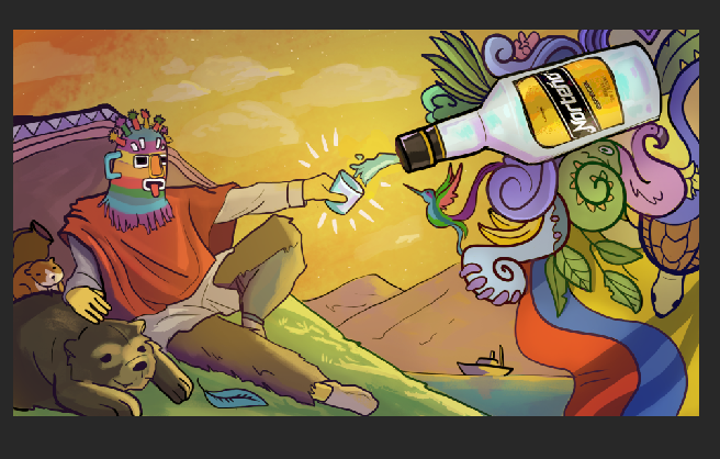La obra representa la unión y la conexión entre la tradición ancestral del aya huma con la identidad contemporánea y moderna de nuestra sociedad, utilizando de referencia la pose de la creación de adán del cuadro de Miguel Angel para un punto de contacto donde la tierra, las tradiciones, la flora, la fauna se unen en un solo espíritu de celebración y orgullo nacional