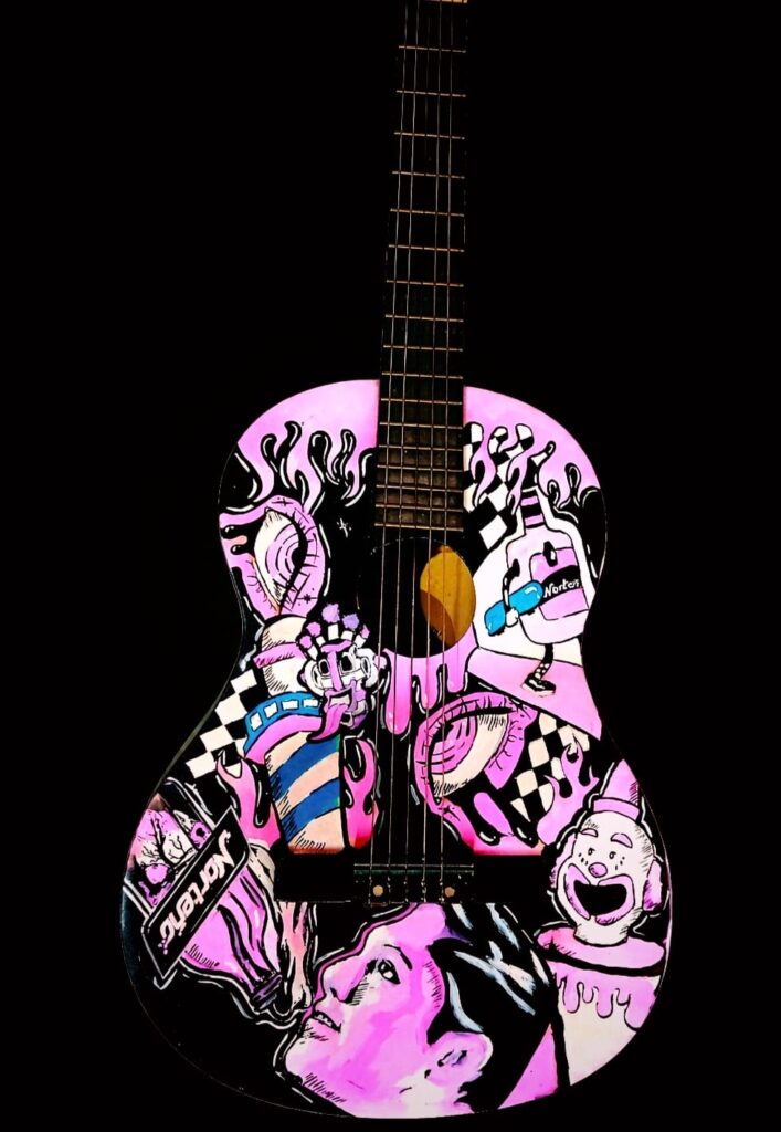 Esta obra nace de la fusión entre la canción “Cuando mi guitarra llora” de Julio Jaramillo y el norteño, una de las bebidas más representativas de la cultura popular ecuatoriana. La guitarra deja de ser instrumento para convertirse en cuerpo emocional: llora, arde y siente. Julio Jaramillo aparece bebiendo norteño como un acto de calma y catarsis. El norteño, con su sabor fuerte y ardiente, se convierte en símbolo de desahogo popular: quema al entrar, pero calma al quedarse. Las llamas representan ese fuego inicial que define su carácter y explica su conexión con los jóvenes ecuatorianos. La guitarra como lienzo, carga íconos del Ecuador cotidiano: el Faro de Guayaquil como luz y memoria, el Diablo Huma como fuerza ancestral y dualidad, y el basurero de payaso como símbolo de infancia y cultura popular. Todos conviven sobre una guitarra que llora, porque en el Ecuador el dolor también se bebe, se canta y se comparte. No es un homenaje idealizado, es una celebración cruda de identidad. Cuando la guitarra llora, un norteño la calma.