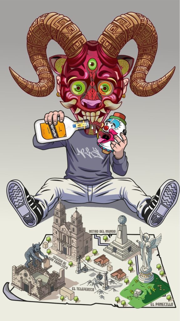 El Aya Huma irrumpe en Quito con una máscara hipnótica y espíritu festivo, mezclando lo ancestral con lo urbano. Con el Norteño en mano, distorsiona la ciudad, a corta distancias se observa la mitad del mundo, convirtiéndose cada rincón en un juego donde manda quien tiene la botella. ¿Te atreves a jugar?