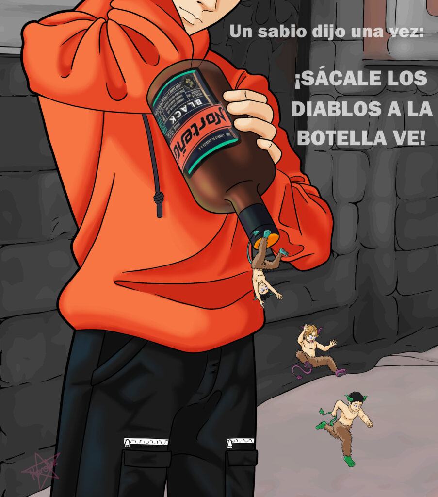 Mi ilustración digital retrata la típica frase de “sacarle los diablos a la botella”, plasmé 3 diablitos cayendo muy sorprendidos ya que los sacaron de su casita (la botella de Norteño Black)