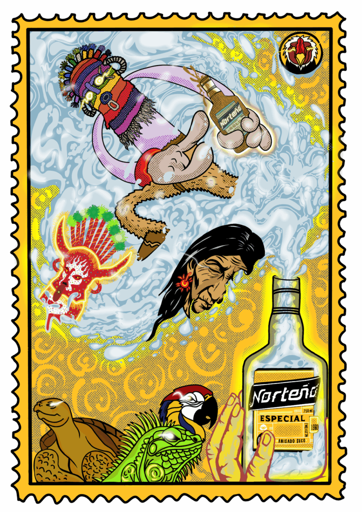 El título de la obra, escrito en quechua traduce la frase ‘Bebamos juntos’. Esta decisión no responde únicamente a un recurso lingüístico, sino a un acto simbólico donde BEBER implica compartir, reconocer al otro y encontrarse uno mismo. Mi ilustración, tiene el propósito de representar una Estampilla que viaja de mano en mano, en la que se ve como el aguardiente se convierte en un elemento ritual del cual emerge el Diablo Huma, el Taita carnaval y una anciana de etnia ecuatoriana , todos estos personajes representan el símbolo ancestral de resistencia, identidad y memoria. De este modo, Upyaychik no es solo una invitación a beber, sino una invitación a reconocernos como parte de un mismo tejido cultural diverso y vivo.